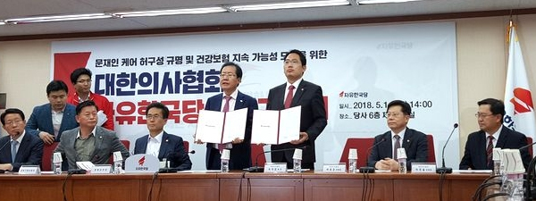 자유한국당과 대한의사협회는 국민의 건강권을 지키기 위한 건강보험제도의 구축을 위해 다음과 같이 함께 노력할 것을 서약한다.