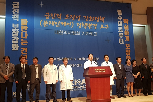 의협은 14일 한국프레스센터 국제회의장에서 '급진적 보장성 강화정책(문재인케어)' 변경 요구를 위한 기자회견'을 열어 "청와대를 비롯해 국회·정부가 문제해결을 위해 적극 나서달라"고 호소했다.