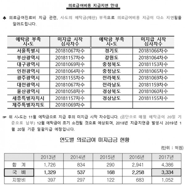 이와 관련 건보공단 보험급여실 관계자는 "작년에는 추경예산으로 5400억원가량 배정됐지만, 올해는 거의 없었다"며 "지난해 의료급여 미지급금 4386억원을 올해 예산에서 선지급했고, 추경예산도 없어서 의료급여비용이 일찍 소진됐다. 12월 예탁금만 남았는데 9월 심사 진료비도 지급하지 못한 시·도가 있다"고 했다.
