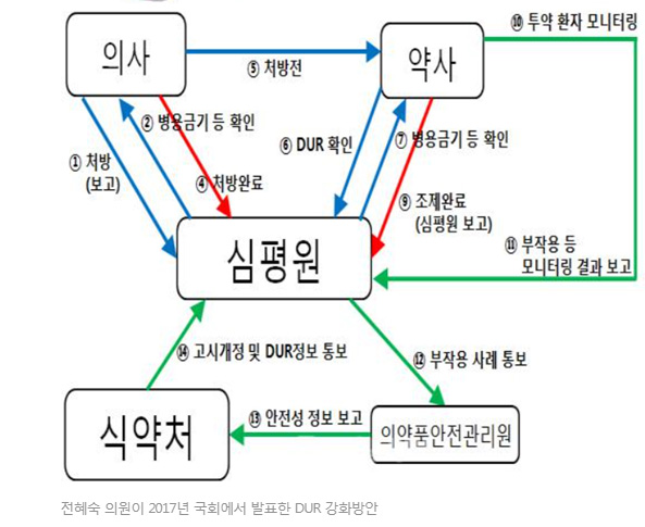 전혜숙 의원은 "의약품을 처방·조제할때 복용약의 중복 여부, 병용금기, 연령금기 등을 확인할 수 있는 DUR의 실효성을 확보해 국민 건강을 보호하려는 것"이라고 개정 취지를 밝혔다.