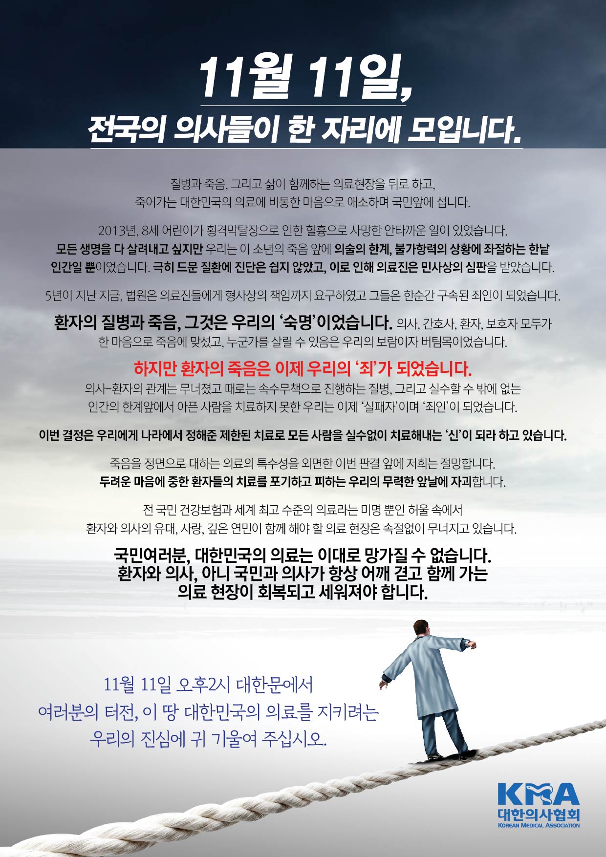 - 11월 11일 전국의사총궐기대회 개최키로... 총파업 계획 밝혀