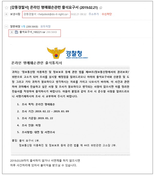 [보안]이메일 문자 등 온라인으로 명예훼손관련 출석 통지서 절대 다운받지 마세요! ‘랜선웨어’입니다