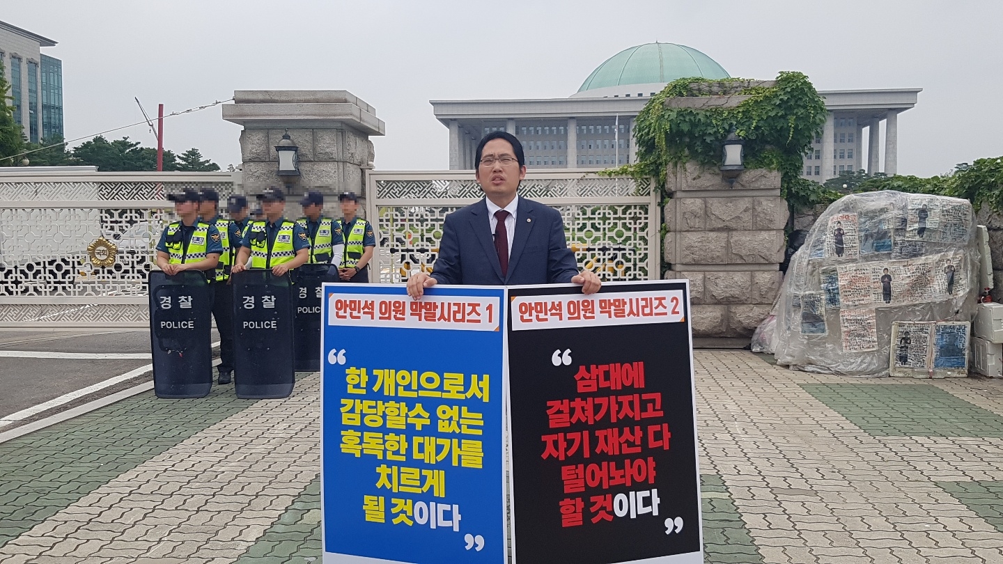 최대집 대한의사협회 회장은 19일 오후 국회 정문 앞에서 경기도 오산 소재 병원급 의료기관의 개설 과정에서 해당 병원 의사를 대상으로 막말을 쏟아낸 더불어민주당 안민석 의원을 대상으로 대국민 사과와 국회의원직 사퇴를 촉구하는 1인 시위를 펼쳤다.