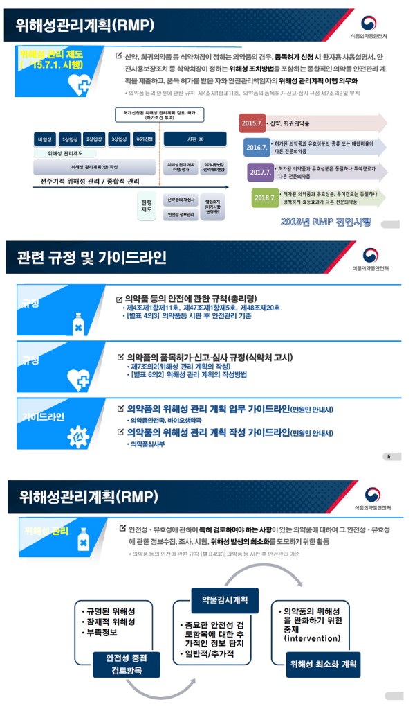 의약품 부작용을 최소화하기 위해 품목허가 신청시 제출해야 하는 '위해성관리계획(RMP)'(2015년7월시행) 안전성 정보 보고는 2년간은 6개월마다, 이후 3년간 1년마다 평가를 실시해 2개월내에 보고해야 한다.