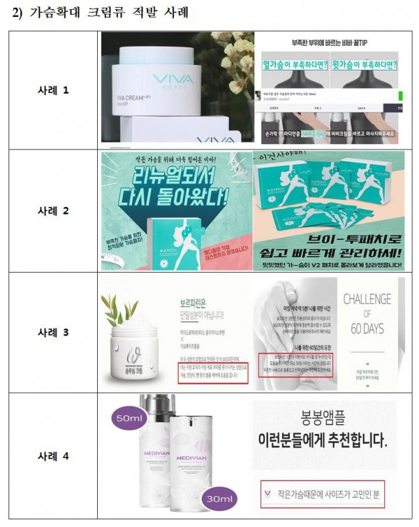 - ‘가슴확대’ 관련 효능을 표방한 화장품(크림류)은 ‘가슴확대’, ‘지방세포 부피 증가’, ‘볼륨 업’ 등 218건이었습니다.