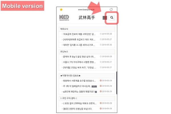 ▷Mobile의 경우 홈페이지 우측 상단의 ‘병장’마크 옆에 ‘돋보기 모양 아이콘‘ click 하신 후 검색 하면 됩니다.