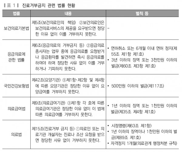 표1은 진료거부를 금지하고 있는 법률 규정입니다.