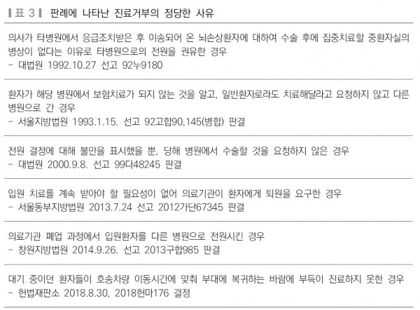 표3은 정당한 진료거부로 판단한 법원 사례입니다.