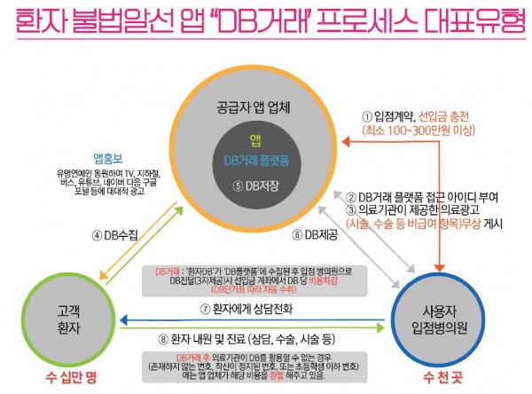 현재 인터넷 상에서는 환자에게 올바른 성형 정보 등을 알려준다는 명목으로 “강OOO, 바OO, 미OOO, 미OO” 등의 「환자 불법알선 앱」이 운영되고 있으며, 일부 앱 업체는 무분별한 비급여가격 할인, 이벤트 제공, 객관적인 근거없는 치료경험담 제공, 객관적 근거에 기하지 않은 의료기관 정보 제공 등을 서슴지 않고 있음은 물론, 환자의 전화번호(DB)를 지정된 병원에 넘기고 이에 대해 비용(광고료)을 받는 불법적인 소개ᆞ알선 행위를 자행하고 있는 것으로 파악되고 있습니다.