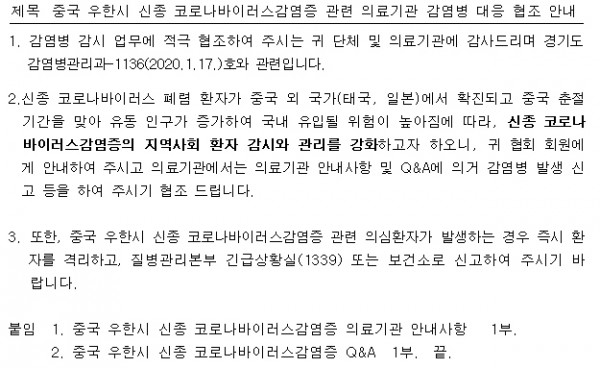 중국 우한시 신종 코로나바이러스감염증 관련 의료기관 감염병 대응 협조 안내(FAQ) 대피연 메일보내기 이름으로 검색 0 12,757 2020.01.29 22:38 첨부파일 - 첨부파일: 1공지.jpg (138.5K) 146 - 첨부파일: 2중국 우한시 신종 코로나바이러스감염증 의료기관 안내사항.hwp (23.5K) 131 - 첨부파일: 3중국 우한시 신종 코로나바이러스감염증 QA.hwp (47.5K) 129 짧은주소 - 짧은주소: https://laserpro.or.kr:443/bbs/?t=5IG 주소복사 × 짧은 글주소 복사 Note! 위 주소를 드래그, 복사(Ctrl+C)하여 사용하세요. 이전글다음글 목록 본문 중국 우한시 신종 코로나바이러스감염증 관련 의료기관 감염병 대응 협조 안내 이전글다음글 목록 댓글목록 등록된 댓글이 없습니다.
