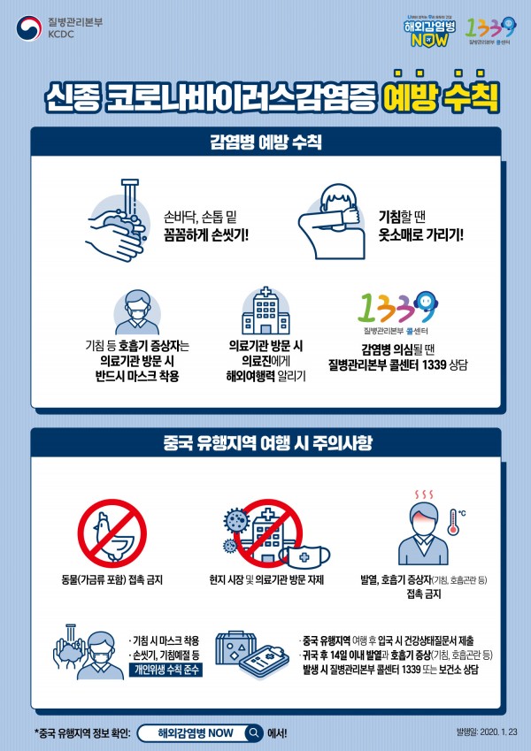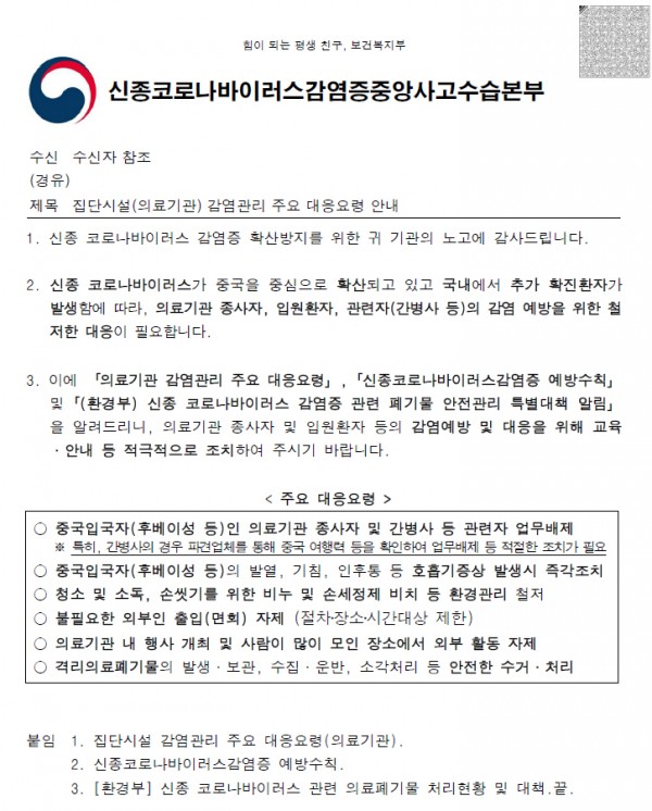 신종코로나바이러스감염증 중앙사고수습본부에서는 「의료기관 감염관리 주요 대응요령」「신종코로나바이러스감염증 예방수칙」 및 「(환경부) 신종 코로나바이러스 감염증 관련 폐기물 안전관리 특별대책 알림」을 알려왔습니다.