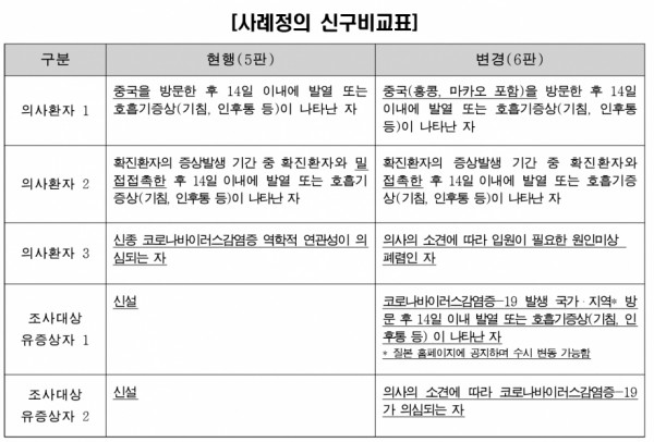 특히 '조사대상 유증상자'를 신설, 검사 대상자를 더욱 구체화했다. 의사환자 사례에서는 중국 외 홍콩·마카오를 포함한 해외를 여행한 경우 등으로 판단 근거를 명시했다.