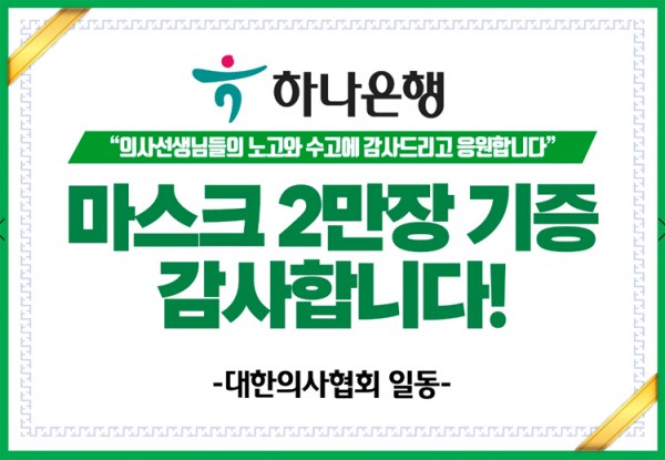 코로나19로 일선 의료기관들이 마스크 확보에 많은 어려움을 겪고 있는 가운데 하나은행에서 방역용 마스크 2만장을 대한의사협회에 기부했다.