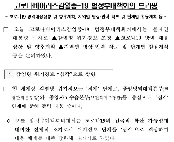 [정부]감염병 위기경보 ‘심각’으로 상향, 대구와 청도는 ‘감염병 특별관리지역’으로 집중 관리