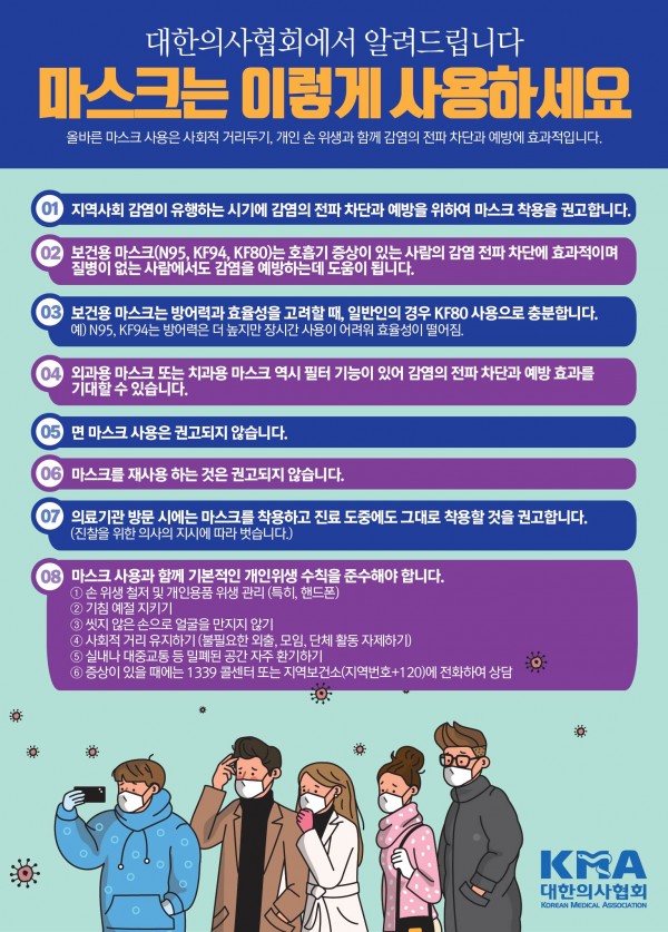 의협은 마스크 권고안을 통해 지역사회 감염이 유행하는 시기에 손 씻기, 사회적 거리두기와 함께 감염 전파 차단과 예방을 위한 마스크 착용을 공식 권고하였다. 특히, 호흡기 증상이 있는 사람뿐만 아니라 질병이 없는 건강한 일반인에서도 보건용 마스크 착용이 감염 예방에 도움이 된다는 점을 분명히 했다.
