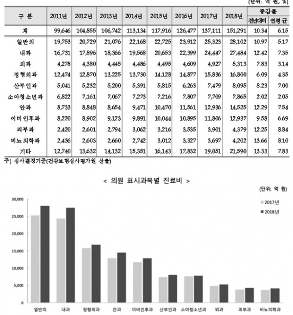 진료비 규모만 놓고 보면 일반의, 내과, 정형외과 순으로 컸다. 전년 대비 진료비 증가율은 비뇨기과, 내과, 안과, 피부과 등의 순으로 나타났다.