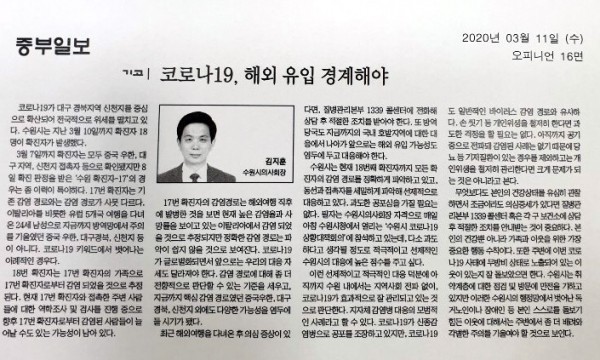 [기고]코로나19, 해외 유입 경계해야 (중부일보)