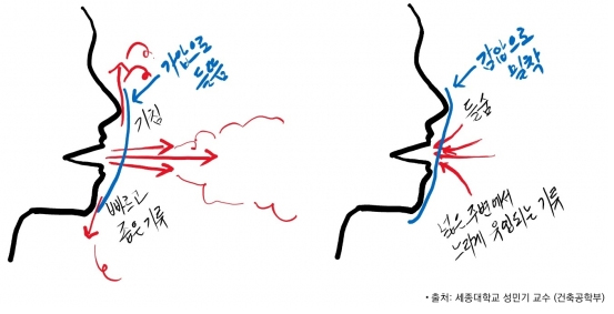 세종대학교 건축공학과 교수는 “마스크의 공기역학적인 특징으로 인해 코로나19 환자가 순간적으로 강하게 기침을 하면 가압으로 마스크가 떠서 그 틈새로 미세 바이러스 입자(에어로졸)가 빠져나간다”며 “들숨 때는 유속이 상대적으로 낮고 감압으로 마스크가 쉽게 들뜨지 않아 외부 비말이 틈새로 침투하기 어렵다”고 설명했다.