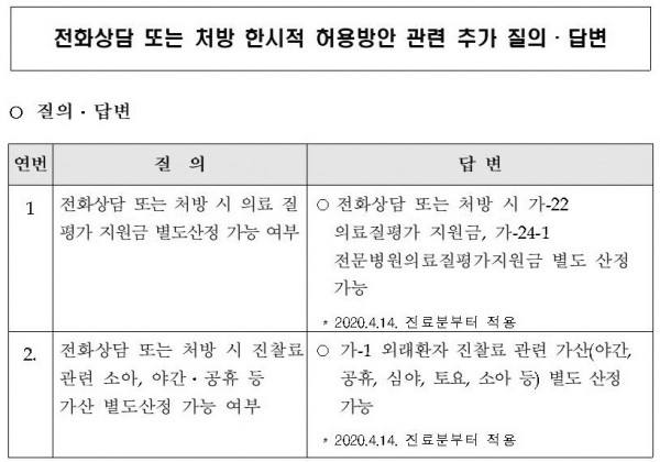 전화상담 및 처방시 4월14일 진료분부터 의료질평가 지원금 별도 산정이 가능하다.