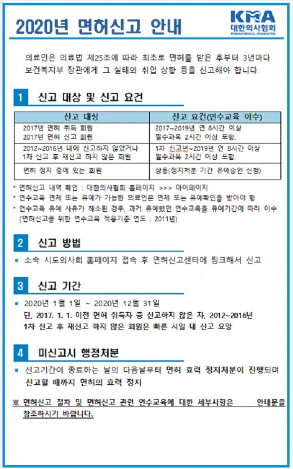 2017년에 면허 신고를 하신 회원님들은 3년마다 한 번씩 하는 면허 신고를 2020년 12월 31일까지 하셔야 합니다.