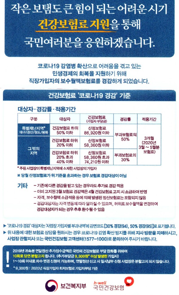 [공단]건강보험료 '코로나19 경감' 지원 대피연 메일보내기 이름으로 검색 0 11,614 2020.04.23 14:24 첨부파일 - 첨부파일: 건강보험료 코로나19 경감 지원.JPG (1.1M) 362 짧은주소 - 짧은주소: https://laserpro.or.kr:443/bbs/?t=69C 주소복사 × 짧은 글주소 복사 Note! 위 주소를 드래그, 복사(Ctrl+C)하여 사용하세요. 이전글다음글 목록 본문 [공단]건강보험료 '코로나19 경감' 지원 이전글다음글 목록 댓글목록 등록된 댓글이 없습니다.
