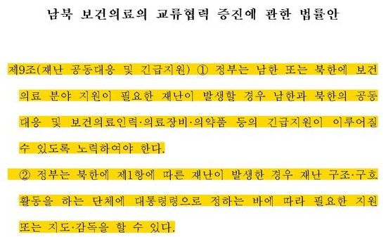 문제가 된 부분은 이법 제9조 '재난 공동대응 및 긴급지원' 부분이다. 9조 1항엔 재난 등 발생 때 남북이 공동으로 보건의료인력·의료장비·의약품 등 긴급지원을 위해 노력해야 한다는 내용이, 2항엔 북한 재난 발생 시 구조·구호 활동 단체에 정부가 필요한 지원이나 지도·감독을 할 수 있다는 내용이 담겼다. 의사 등 의료인력을 '긴급지원' 차원에서 북한에 파견할 수 있다는 해석이다.