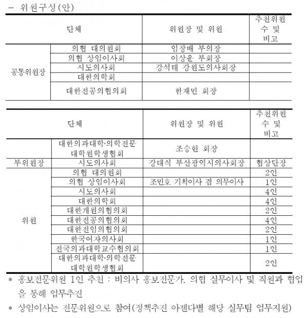 의협은 10월 21일 제125차 상임이사회에서 범투위 조직 구성을 의결했다. 범투위 공동위원장은 임장배 의협 대의원회 부의장·이상운 의협 부회장·강석태 강원도의사회장·박정율 대한의학회 부회장·한재민 대한전공의협의회장·조승현 대한의과대학의학전문대학원학생협회장이 맡기로 했다. 부위원장은 강대식 부산광역시의사회을, 간사는 조민호 의협 기획이사 겸 의무이사를 선임했다.