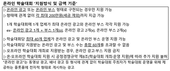 아울러 학술대회를 오프라인으로 개최하며 지원을 받는 경우에는 온라인 광고나 부스 지원을 받을 수 없다.