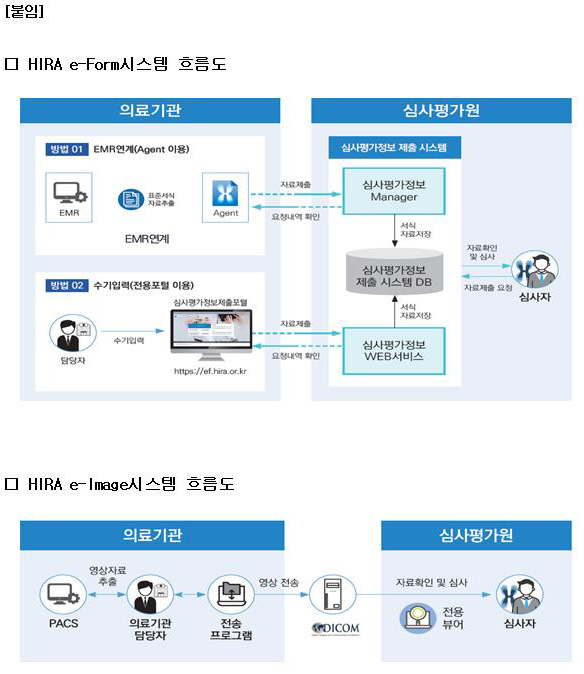 ‘심사평가정보 제출시스템’은 의료기관에서 진료비 심사 등에 필요한 각종 자료(진료정보)를 전자적으로 쉽고, 안전하게 제출하는 시스템이다. 의료기관에서 제출하고자 하는 자료의 형태에 따라 ‘HIRA e-Form시스템’과 ‘HIRA e-Image시스템’ 2가지로 선택 가능하다.