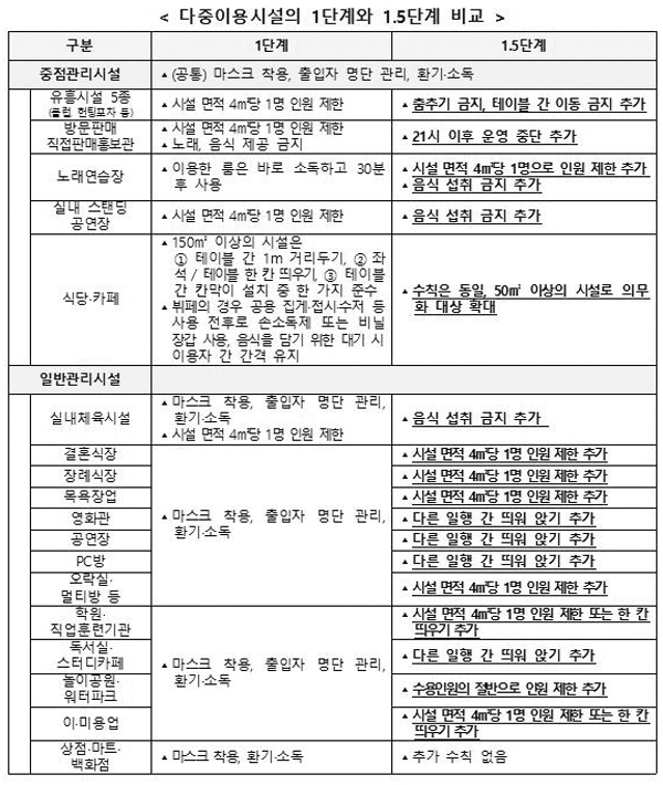 다중이용시설 중 중점관리시설은 이용 인원의 제한을 확대하고, 클럽에서의 춤추기, 노래연습장에서 음식 섭취 금지 등 위험도가 높은 활동을 금지한다.