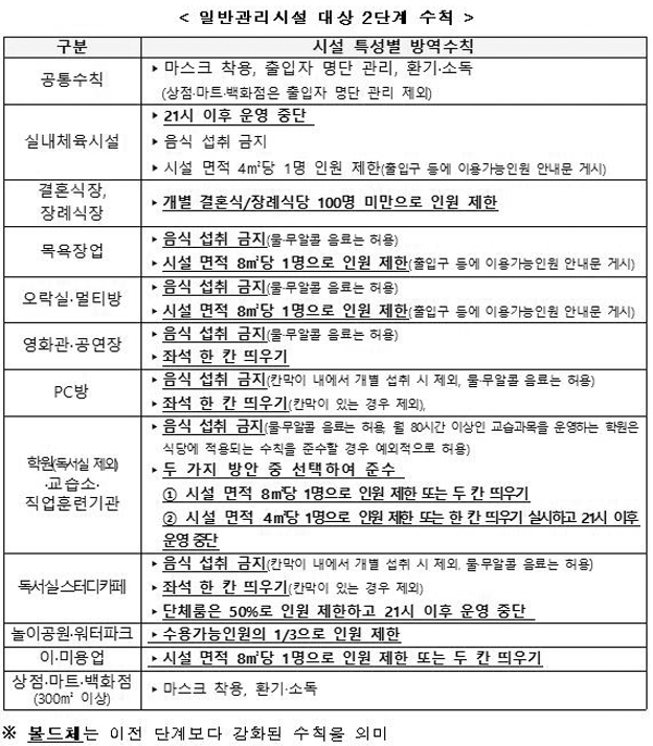 - 이와 함께 마스크 착용, 출입자 명단 관리, 환기·소독 등이 공통적으로 의무화된다.