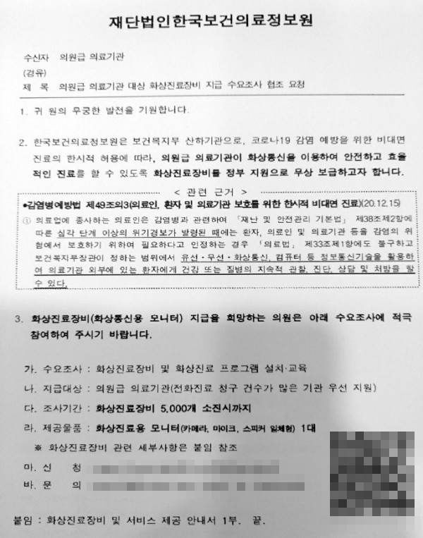 최근 ‘한국보건의료정보원’이란 곳에서 ‘화상진료장비 수요조사‘라는 공문을 불특정 다수의 의원급 의료기관에 발송 하였다고 합니다.