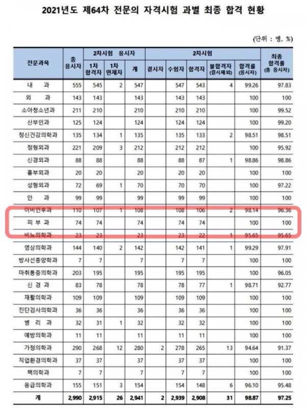 이번 2차시험에서 응시자가 가장 많았던 내과의 경우 547명이 응시해 4명이 불합격하면서 97.83% 합격률을 보였으며, 1차(98.55%)보다도 낮게 나타났다.