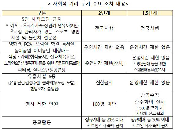 * 노래연습장, 실내체육시설, 목욕장업, 음식점‧카페(22시 이후 포장‧배달만 가능), 파티룸, 실내스탠딩공연장, 방문판매 등을 위한 직접판매홍보관(수도권 약 43만 개소, 비수도권 약 52만 개소 중 2단계 지역 업소만 해당)