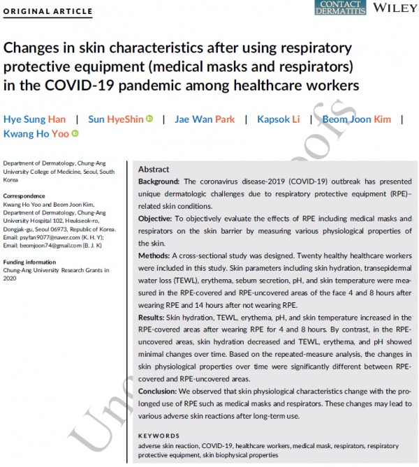 이런 가운데 중앙대학교병원 피부과 유광호, 김범준 교수와 한혜성 전공의 연구팀이 최근 의료 종사자들의 안면 마스크 착용 후 피부에 미치는 생화학적 변화 영향을 분석한 연구 논문을 발표했다.
