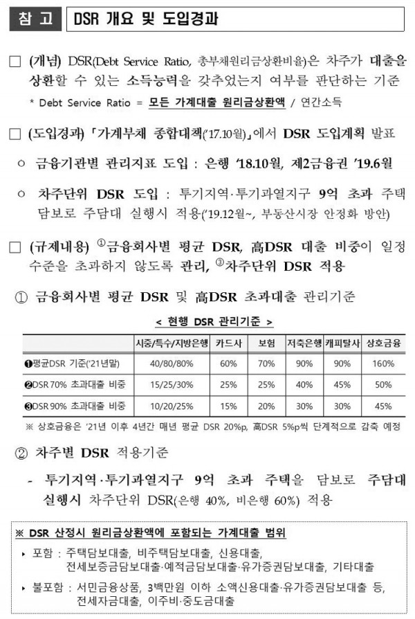 * 다만, 제도 시행 전이라도 규제 선수요를 차단하기 위해 금융기관들이 자율적으로 차주단위 DSR(고소득자의 고액 신용대출 대상)을 적용․운영하도록 권고할 예정