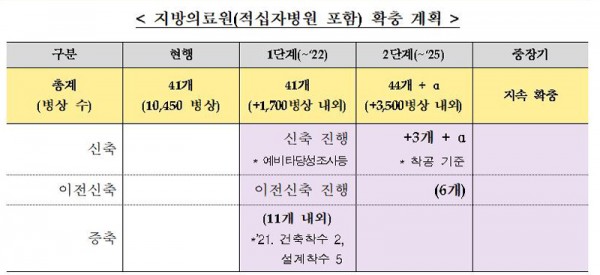 앞으로는 진료권 내 적정 병원이 없는 지역을 중심으로 400병상 규모의 지방의료원 등을 2025년까지 20개 내외 확충하고, 5천병상을 늘릴 계획이다.