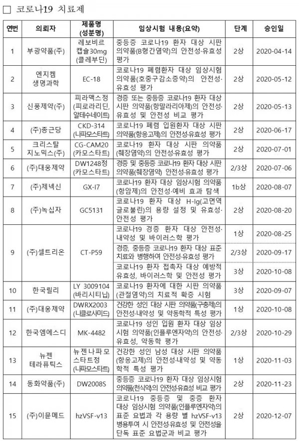 국내에서는 새로운 코로나19 치료제로 개발 중인 항체치료제 등 총 15개 제품(13개 성분)에 대한 임상시험이 진행 중입니다.