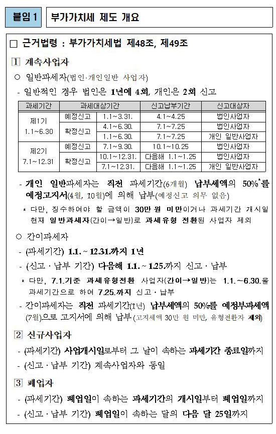 (개요) 부가가치세 과세사업자는 신고대상 과세기간의 사업 실적에 대한 부가가치세를 신고․납부하여야 합니다.(붙임1,2)