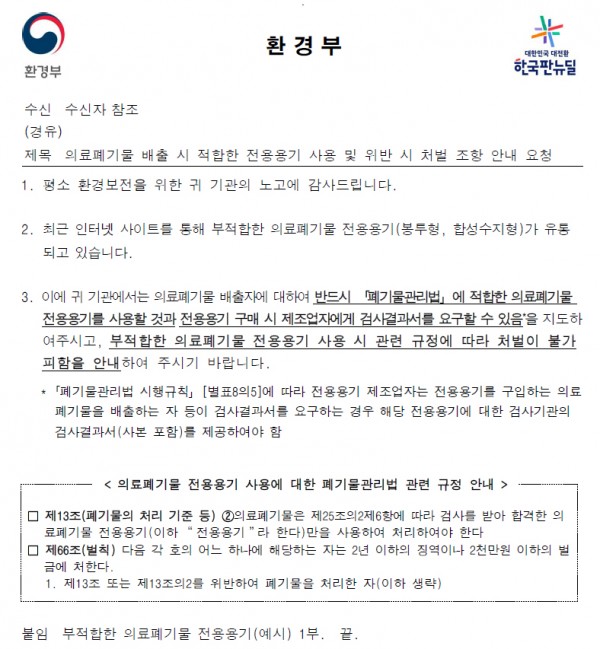[환경부]의료폐기물 배출시 적합한 전용용기 사용 및 위반시 처벌조항 안내 대피연 메일보내기 이름으로 검색 0 14,059 2021.01.15 11:50 첨부파일 - 첨부파일: 붙임1. 환경부 공문.pdf (111.9K) 152 - 첨부파일: 붙임2. 부적합한 의료폐기물 전용용기예시.hwp (6.7M) 177 - 첨부파일: 환경부1.jpg (501.0K) 124 짧은주소 - 짧은주소: https://laserpro.or.kr:443/bbs/?t=7rD 주소복사 × 짧은 글주소 복사 Note! 위 주소를 드래그, 복사(Ctrl+C)하여 사용하세요. 이전글다음글 목록 본문 [환경부]의료폐기물 배출시 적합한 전용용기 사용 및 위반시 처벌조항 안내 최근 인터넷에서 판매되는 부적합한 의료폐기물 전용용기(봉투, 비닐)가 유통되고 있는데, 적합한 전용용기를 사용하지 않으면 처벌된다고 합니다.자세한 내용은 환경부 공문 참고 하시기 바랍니다. 붙임1. 환경부 공문붙임2. 부적합한 의료폐기물 전용용기(예시). 이전글다음글 목록 댓글목록 등록된 댓글이 없습니다.