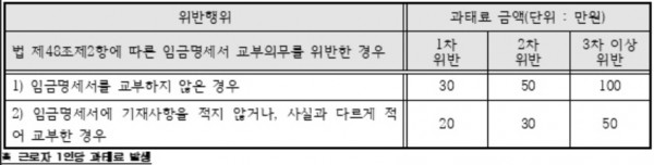 임금명세서 교부 의무 대상 사업장은 근로자를 1명 이상 고용하는 전체 사업장이며, 이를 위반하는 경우 근로기준법 제116조 제2항 제2호에 따라 500만원 이하의 과태료 부과 조치가 이뤄질 수 있다.