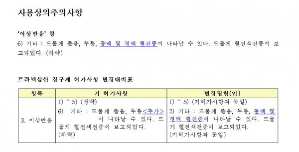 식약처는 2021년 2월 ‘의약품 품목 허가사항 변경명령 알림’을 통하여 트라넥삼산 성분 제제의 허가사항 중 ‘이상반응’에 “동맥 및 정맥 혈전증이 나타날 수 있다”는 내용을 추가하였다고 밝혔고, 이에 따라 허가사항이 변경되어 2021년 6월부터 시행 중에 있습니다.
