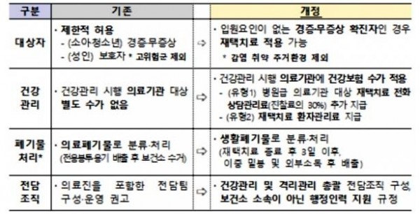 대상자도 대폭 확대했다. 기존에는 재택치료를 소아·청소년 경증·무증상 확진자와 보호자, 1인 가구 등 제한적으로 허용했다. 개정안에서는 입원요인이 없는 경증·무증상 확진자인 경우, 모두 재택치료 적용을 가능토록 했다. 단, 감염 취약 주거환경은 제외했다.
