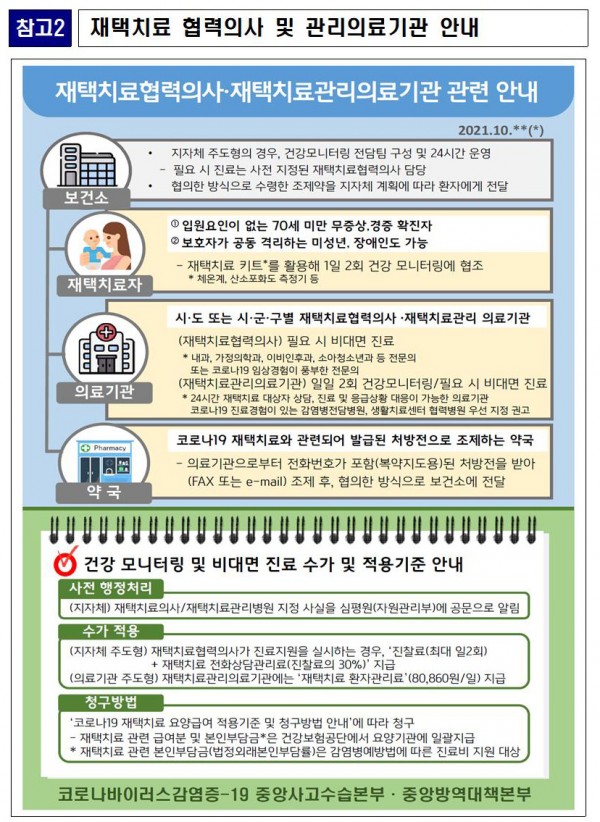 - 재택치료 대상자의 건강관리를 위해 지역사회 의료기관을 활용하여 의료진에 의한 건강모니터링과 비대면 진료·처방를 실시하도록 하고, 건강보험 수가를 지급한다.