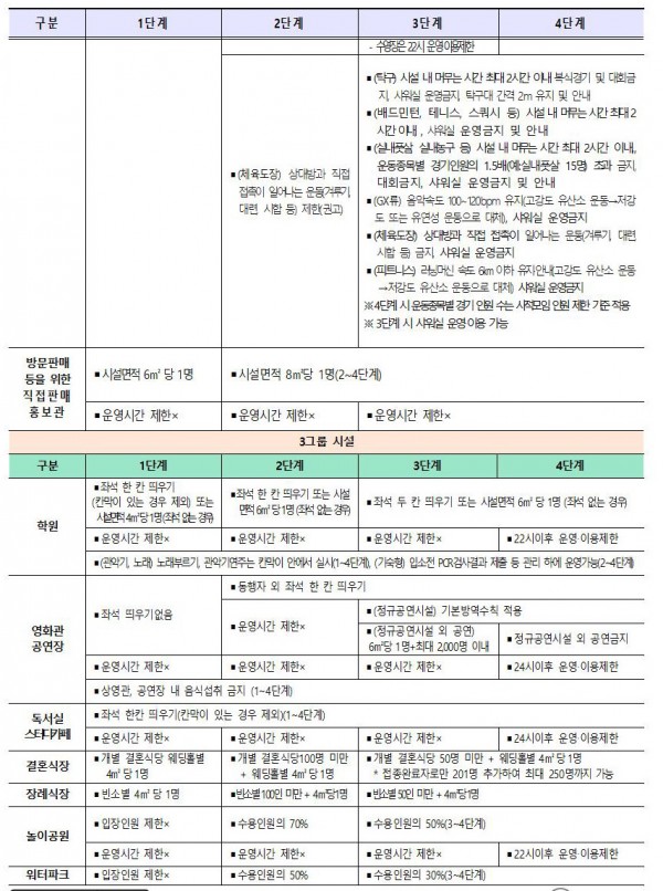 ○ 방문판매 등을 위한 직접 판매 홍보관의 경우 3~4단계에서 22시 운영시간 제한을 해제한다.