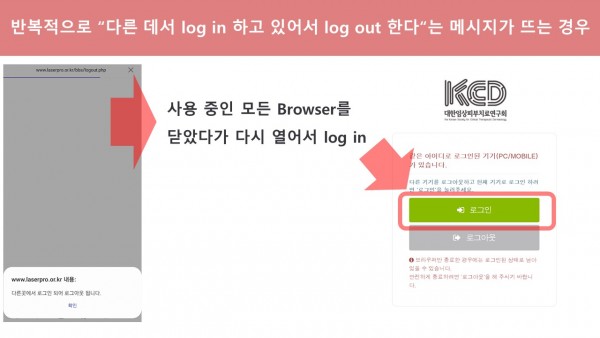 ▷모바일 접속 시, 반복적으로 “다른 데서 log in 하고 있어서 log out 한다“는 메시지가 뜨는 경우