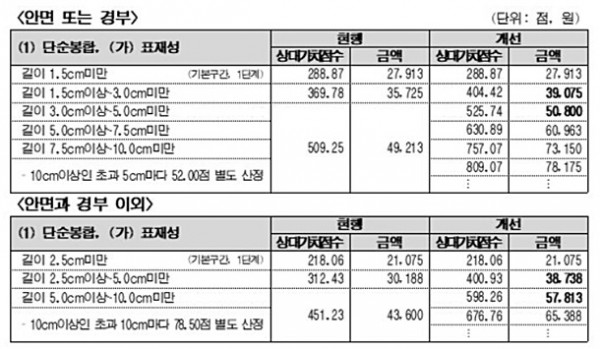안면·경부 부위는 5단계, 안면·경부 이외 부위는 3단계로 재분류 하되 기본 구간 외 2단계 이상 구간의 보상금액을 3~49% 인상한다.