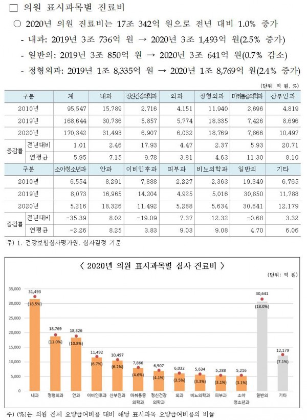 [공단]의원 진료비 1.0% 증가, 피부과 7.37% 증가(2020년 건강보험통계연보)