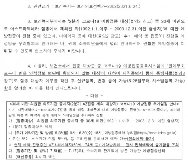 ▷30세 미만 의원급 의료기관 종사자(2분기 AZ접종 제외 대상자) 코로나19 예방접종 추가일정 안내