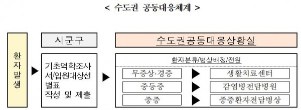 - 서울·경기·인천에 환자가 발생하면, 수도권 공동상황실(국립중앙의료원)을 통해 중증도에 따라 환자를 분류하고 공동활용 병상 등에 배정한다.
